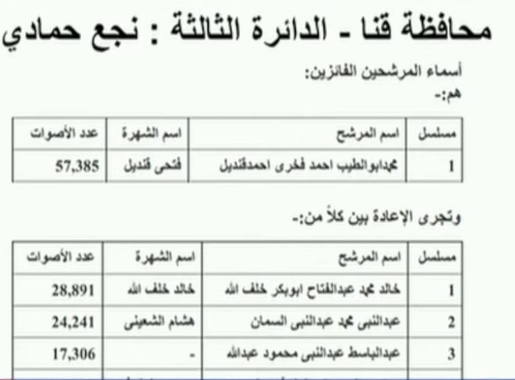 أعلن رئيس الهيئة فوز مرشح والإعادة بين 4 آخرين بالدائرة الثالثة في نجع حمادي بـ قنا وهم: الفائز محمد أبو الطيب – إعادة بين خالد محمد وعبدالنبي محمد وعبدالباسط عبدالنبي – محمود السيد.