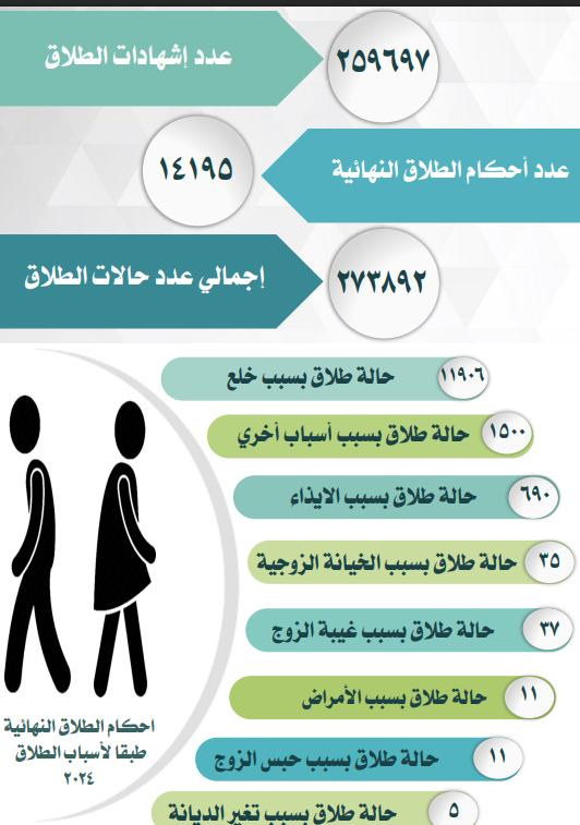وأوضحت البيانات أن حالات الطلاق بسبب الخلع جاءت في المقدمة بعدد 11,906 حالة، تلتها حالات الطلاق لأسباب أخرى بعدد 1,500 حالة، بينما سُجلت 690 حالة طلاق بسبب الإيذاء.